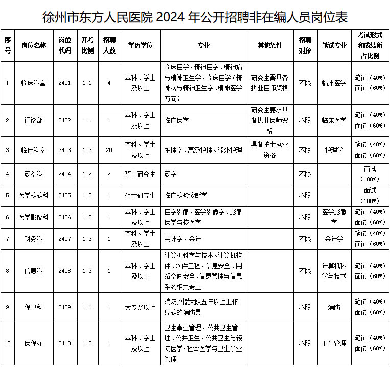 (六)具备《徐州市东方人民医院2024年公开招聘非在编人员岗位表》中岗位要求的资格条件。工作经历计算的截止时间为2024年8月31日;